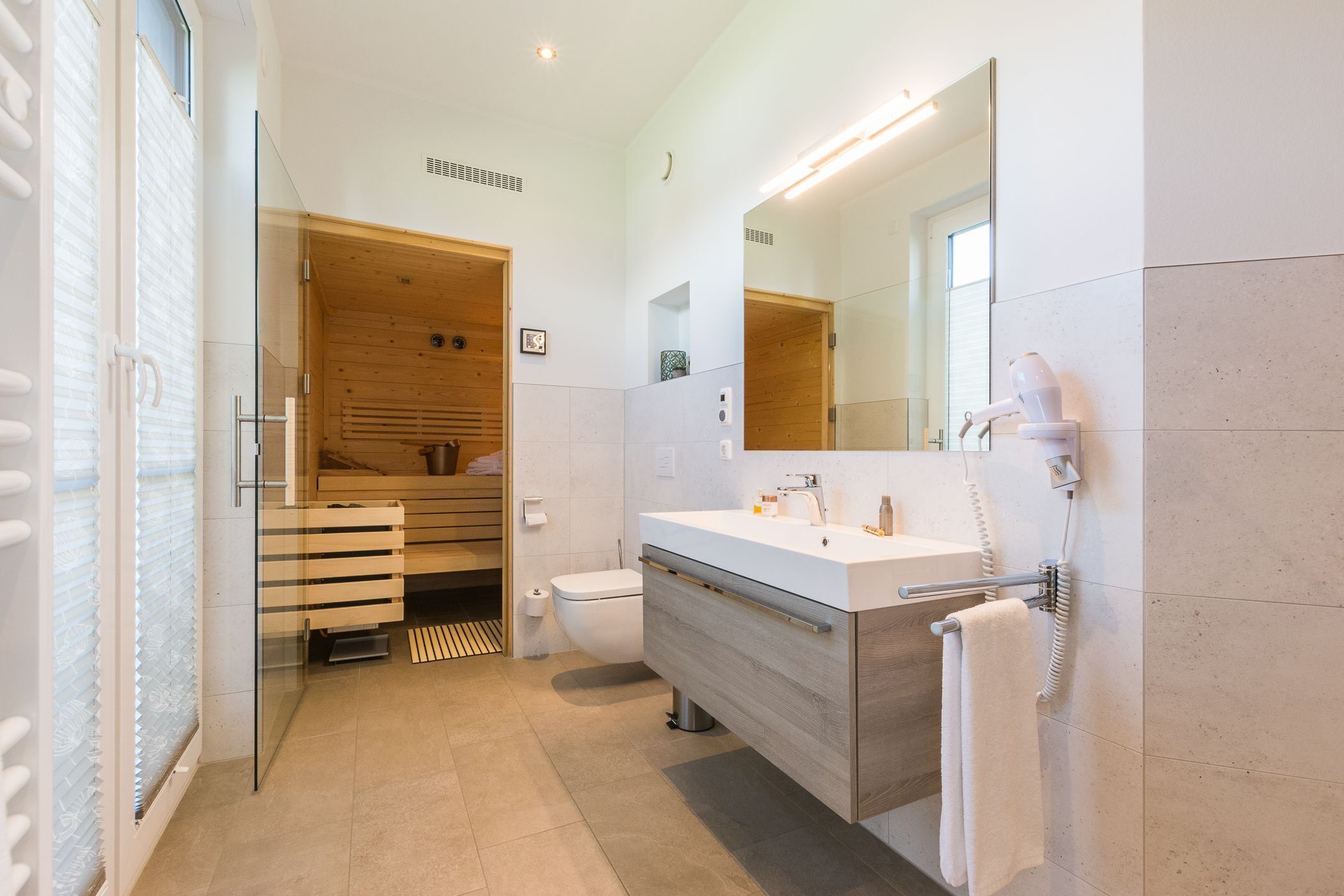 Hablando de respirar, ¿te apetece una sauna? En uno de los 2 cuartos de baño de lujo podrá disfrutar de la relajante relajación de la sauna. Nivel del suelo, duchas Raindance acristaladas, calentador de toallas, lavabos de diseño y radios incorporados (sauna incl. Blutooth acceso para su propia m����sica) le permite relajarse en un nuevo día lleno de acontecimientos. Juegos de toallas y sauna son opcionales.