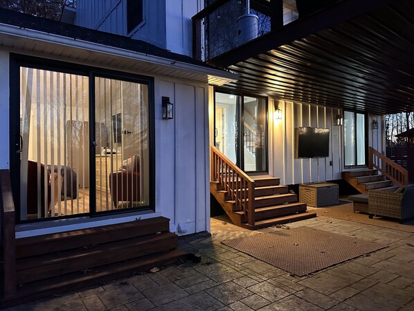 The Farmhouse at Saluda Farms is surrounded by nature, with peaceful views of the woods and the Saluda River from the two back decks that invite you to explore the trails down to the river. The firepit—fully stocked with wood, fire starters, and seating is steps from the front deck and parking area.The open, high-ceilinged main level of the three-story home combines the kitchen, dining, living, and play areas with a half bath. It is uncluttered, and perfect for gathering, with a foosball table, puzzles, board games, and cards available. The living area offers plenty of comfortable seating, a large-screen TV, and an electronic fireplace, and the décor feels welcoming without being fragile.The house is exceptionally well stocked for cooking and entertaining, with plenty of appliances, pots, pans, dishes, and cocktail glasses. There are multiple ovens and refrigerators, an eight-burner stove, and a stand-alone ice maker. The open kitchen layout makes it easy for several people to cook at once without feeling crowded.The top-floor master suite is quiet and private, with a walk-through full bathroom leading to a large walk-in closet and laundry room, plus plenty of drawer space. On the lower level, two bedrooms and a full bath open onto a large deck with a hot tub, making it a great spot to relax.The hosts provided clear directions, were friendly, and were very quick to respond to questions or issues. Checkout was simple and fast, making the entire stay smooth and enjoyable