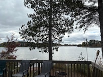 *Chalet-style home with half-log siding and wraparound deck steps from water’s edge