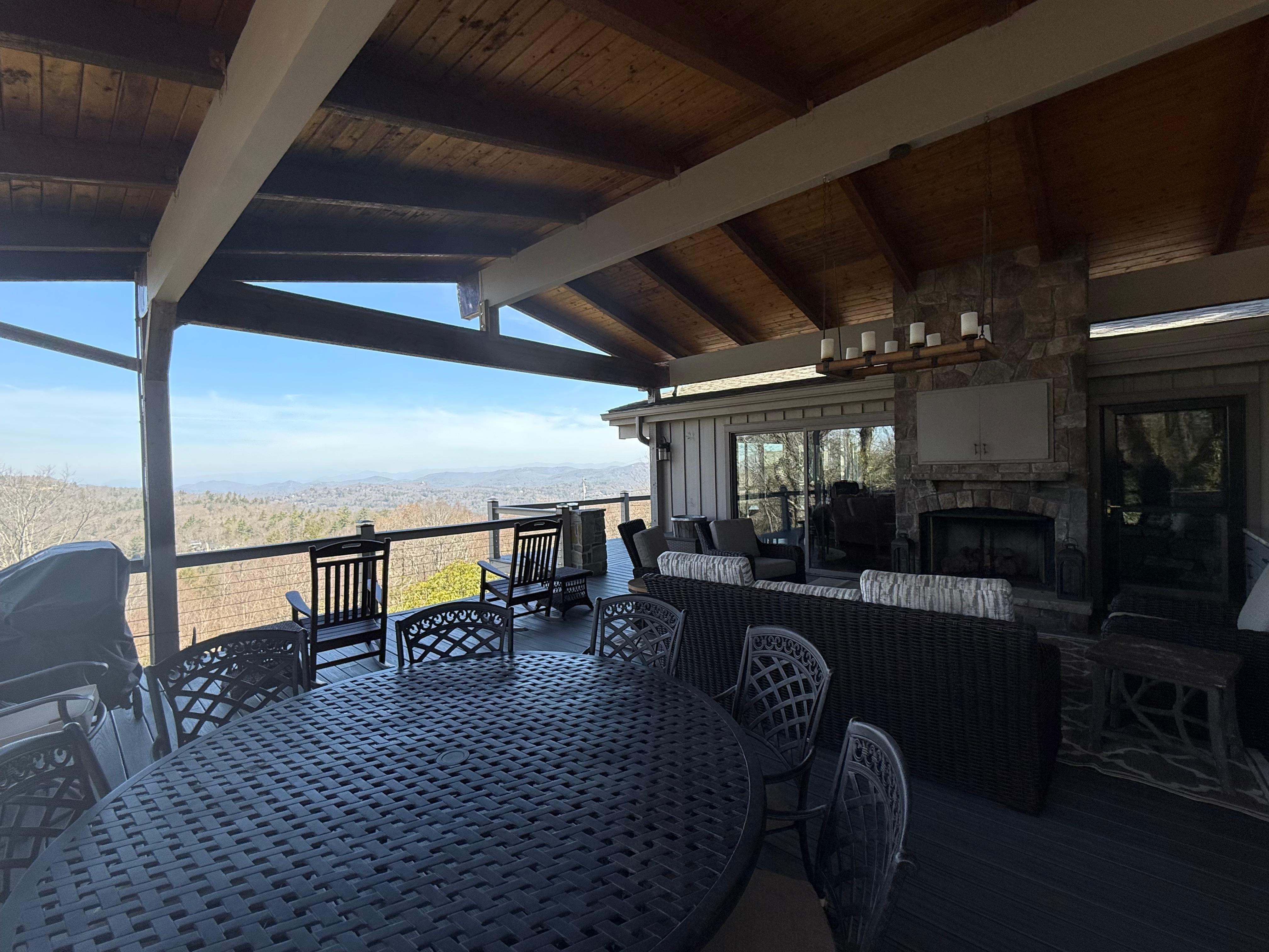 Baño privado, esencialmente cuatro master suites. La gran sala está anclada por una enorme chimenea de piedra y frente a una pared de ventanas con impresionantes vistas de Shortoff Mountain, Yellow Mountain y más allá de las montañas Balsam y Blue Ridge Parkway. Estas vistas son aún más impresionantes desde el enorme porche cubierto que se expande 33 por 27 pies con una nueva chimenea de gas.