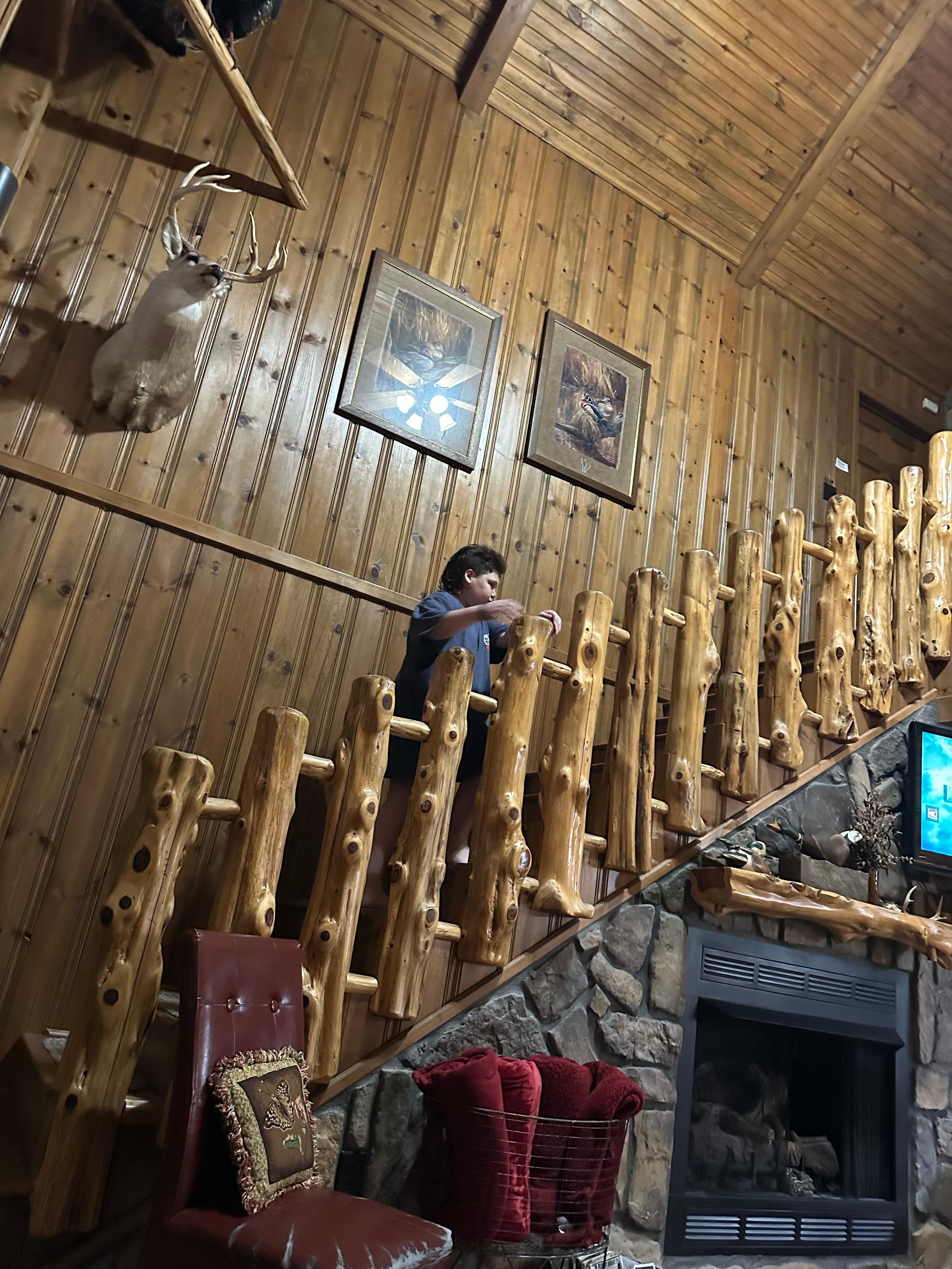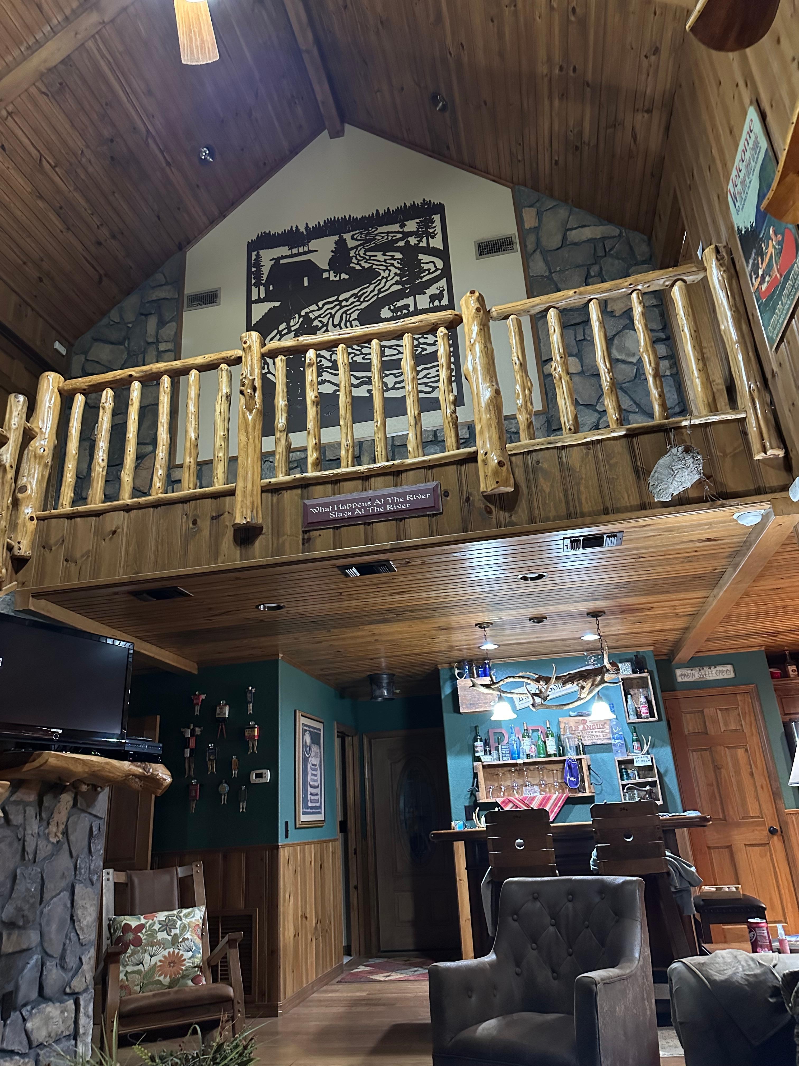 La amplia sala de estar cuenta con un techo estilo catedral de 30 pies con una impresionante vista panorámica del río e incluye una chimenea de gas. Los huéspedes disfrutarán de alojamientos que incluyen lavadora / secadora de tamaño completo, pabellón cubierto al aire libre, fogatas, parrillas de gas y carbón, así como el uso completo de kayaks y juegos al aire libre.