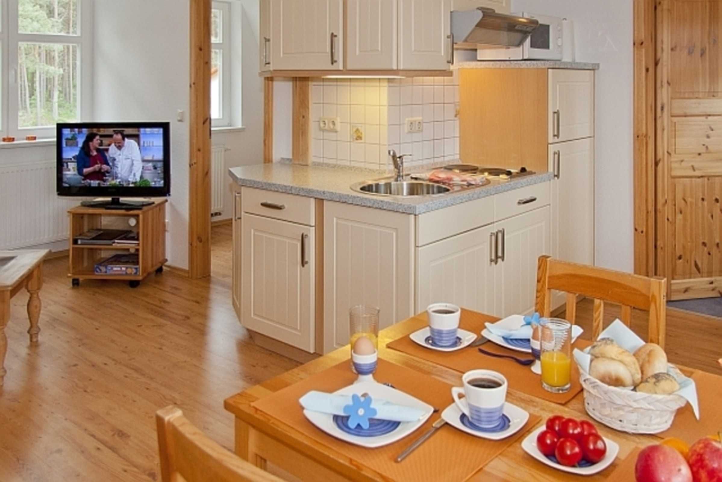 Apartment Carolin EC: The living room has a double sofa bed, radio / TV, coffee table, rattan chairs u. Dinette equipped, the bedroom with double bed. The kitchen includes u. a.Herd incl. Oven, refrigerator with freezer, crockery. The bathroom has a shower, toilet and. Vanity, hair dryer. The apartment includes terrace, charcoal grill, parking