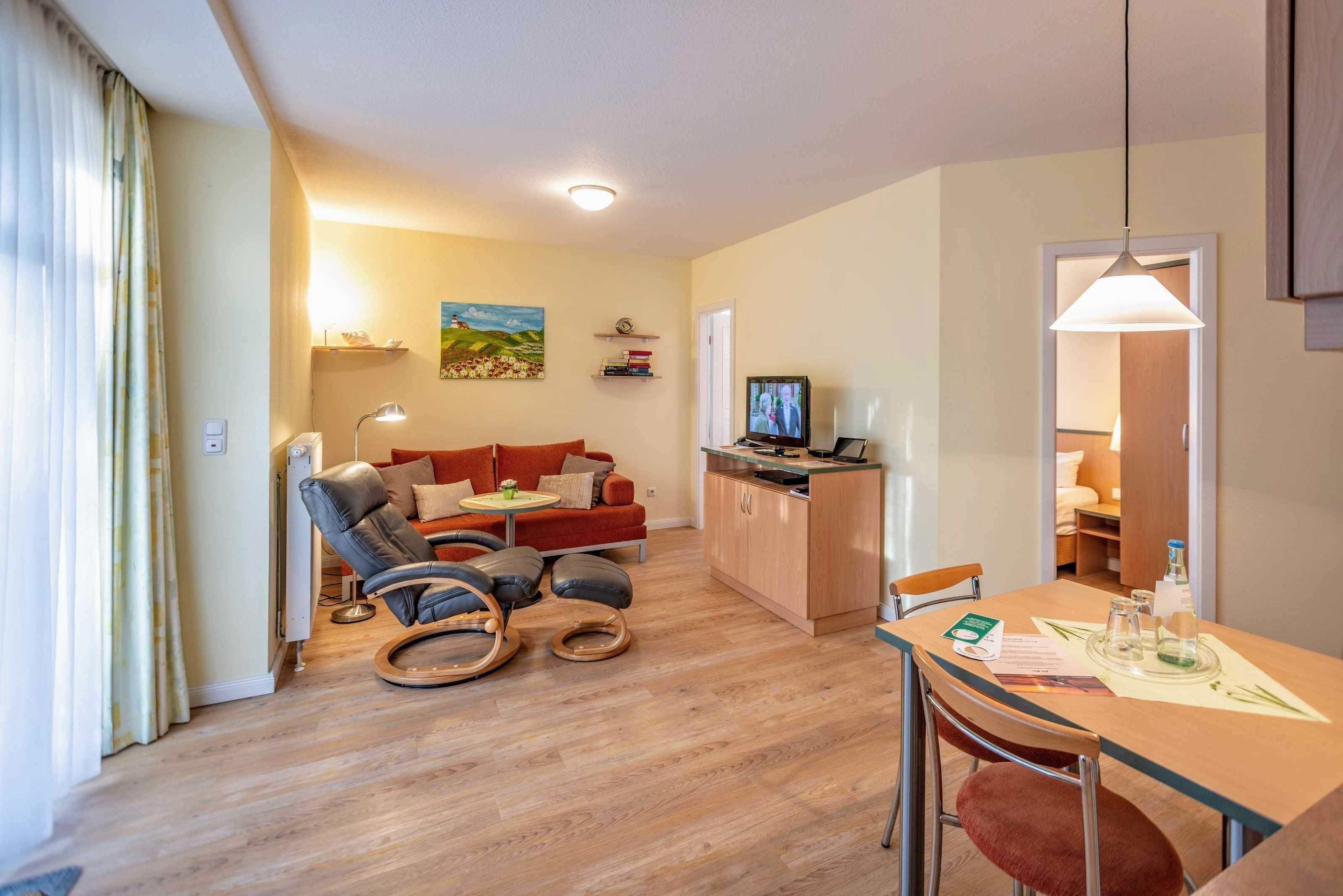 The 2-bedroom apartment with carpeting is located on the 2nd floor of the house Waldeck. With approximately 50 m² living space and a balcony on the north side, there is a spacious apartment of a living room with sofa bed and a fully equipped kitchenette with dishwasher, refrigerator, microwave, two-ring ceramic hob, coffee maker, kettle and toaster. The master bedroom has a double bed and a single bed, in addition, it provides enough space for a cot. The bathroom has a bath, a hair dryer is provided to you. The apartment is suitable for a maximum of 3 adults and a total of 4 persons.