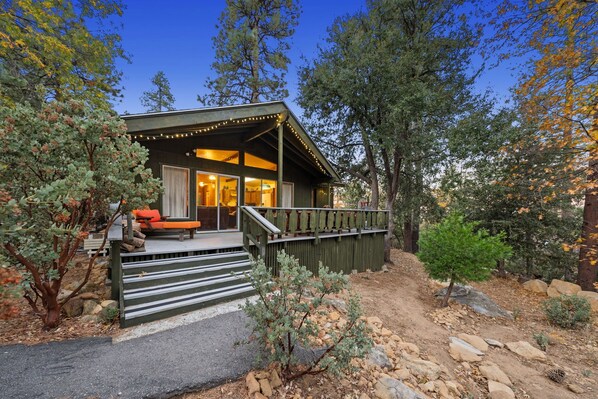Tucked away in the pines, this retro cabin is private and peaceful. With just two steps up into the home, it offers easy access and a relaxing mountain retreat.