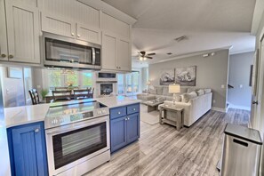 The large living room is the perfect place to hang out after a long day in the sun. This contemporary space features a comfy couch, plush chairs, and a large flat-screen Smart TV with streaming channels and YouTube.