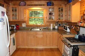 Cabin sleeps five, with a queen bed in the master bedroom on main floor, a double log bed and a queen bed in the loft, as well as a twin rollaway in walk in closet. The bathroom is off the spacious den. There is an air conditioner in the master bedroom. Normally the cabin stays quite cool by following a few easy tips. Please help yourselves to the well stocked kitchen and linens. A brand new gas stove is in kitchen. Large TV in the den with lots of movies to watch. Two twelve by twelve foot Canopies right on the water with a stocked fire pit and hammocks nearby. Electricity, WIFI, refrigerator and rain barrel all conveniently located. Large outdoor screen with Bluetooth speaker for viewing movies or concerts also down by the water. New, a private screened gazebo right on the water with a gas firepit 100 ft from the main area (where the tent used to be).