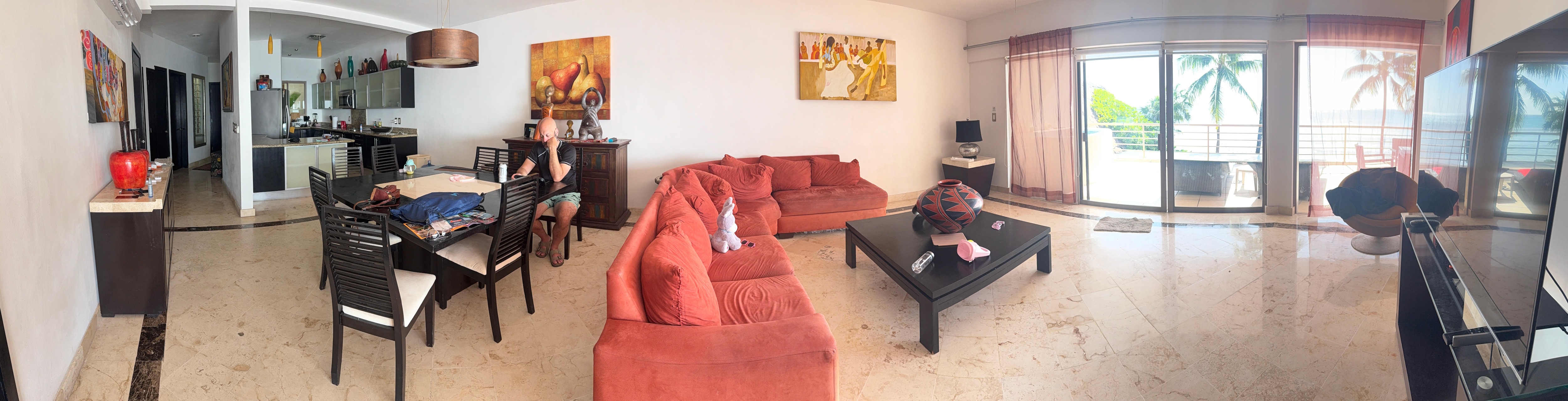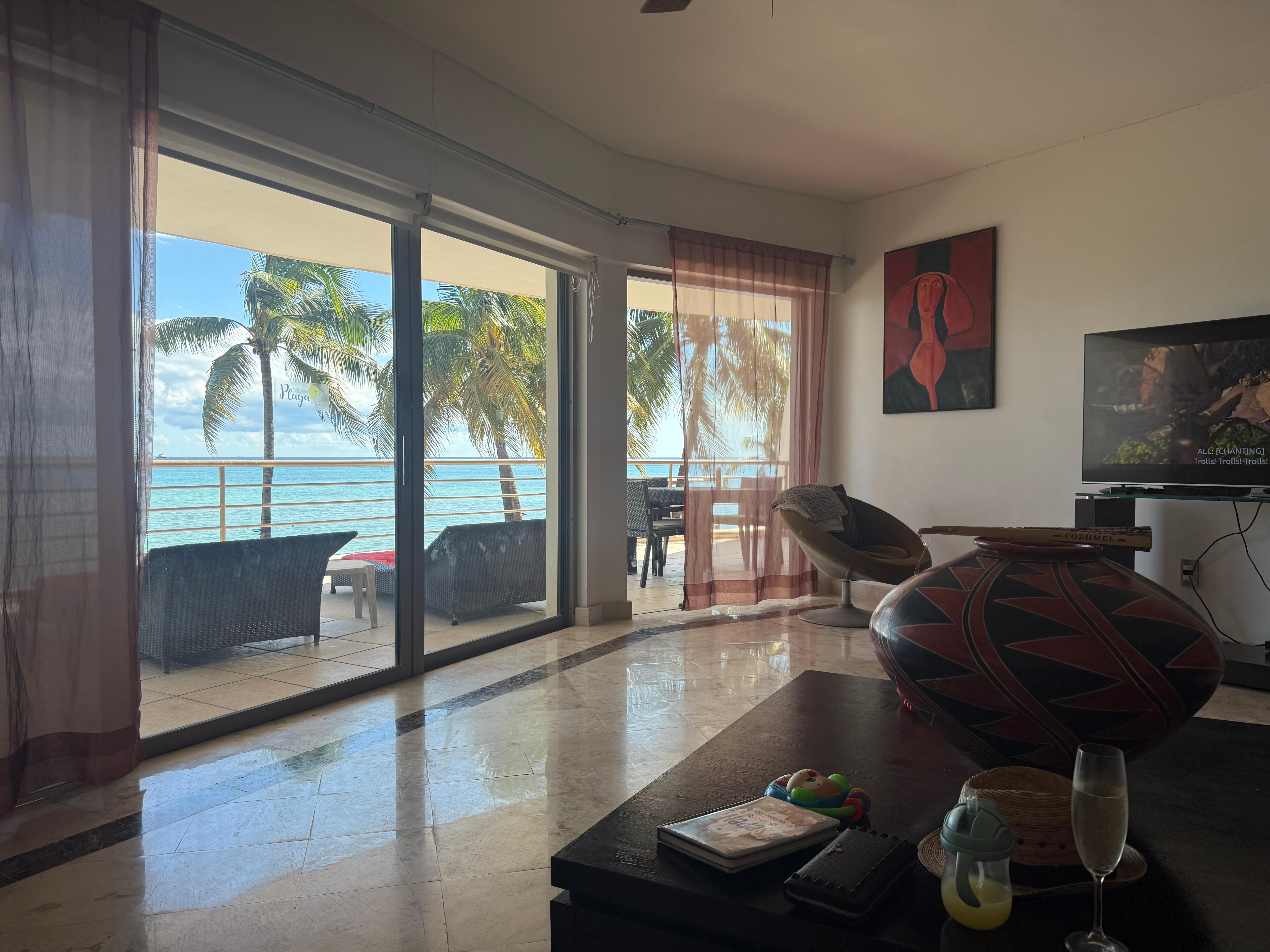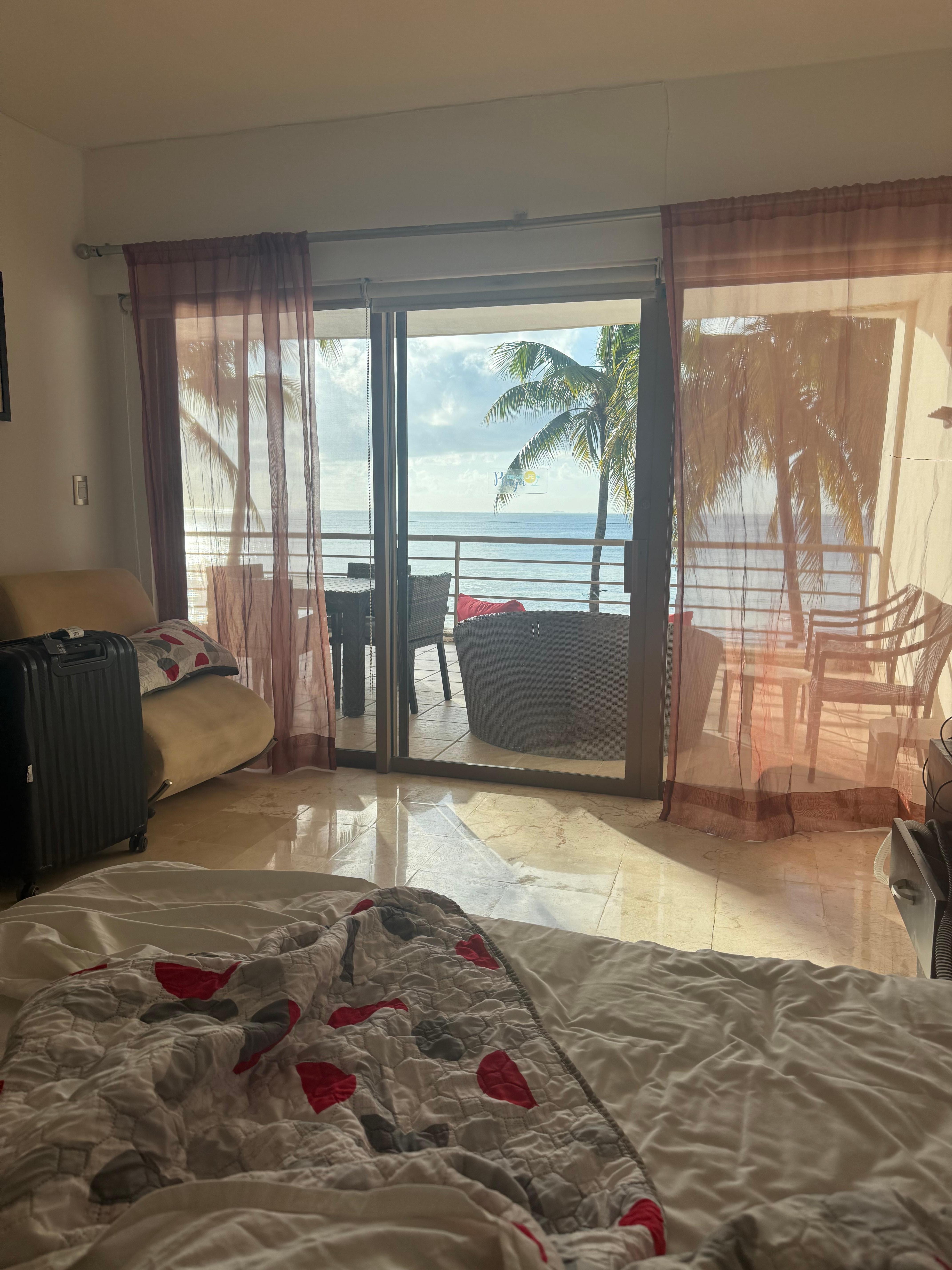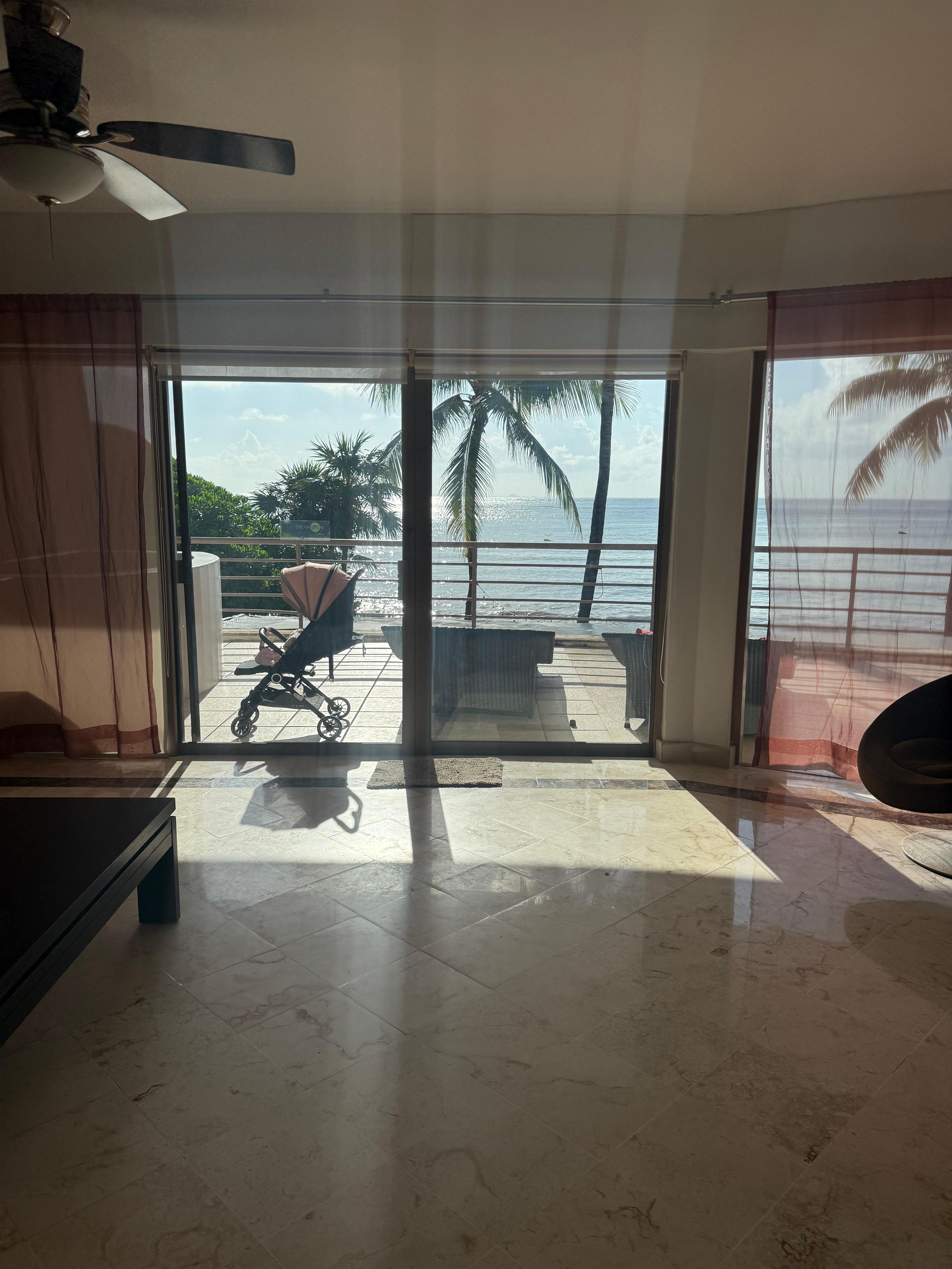 The view from the condo was absolutely amazing! There was basically nothing between us and the water, except the restaurant/nightclub underneath the condo unit. We could leave our doors open at night and listen to the waves (once the live band in the nightclub below us stopped playing). We could walk to Quinta Avenida in 2 minutes where we had our pick of restaurants and places to shop. We were about a 10 minute walk from a grocery store. The staff at the condo were incredibly nice and helpful when we needed it.We were, however, disappointed that the jets on the hot tub on the deck were not working and that there was no pool as advertised. There were also some used underwear found between the bed and the headboard in the guest room, which was a bit disconcerting.Overall, it was a great condo that I would recommend as long as you are okay with no pool and no working hot tub.