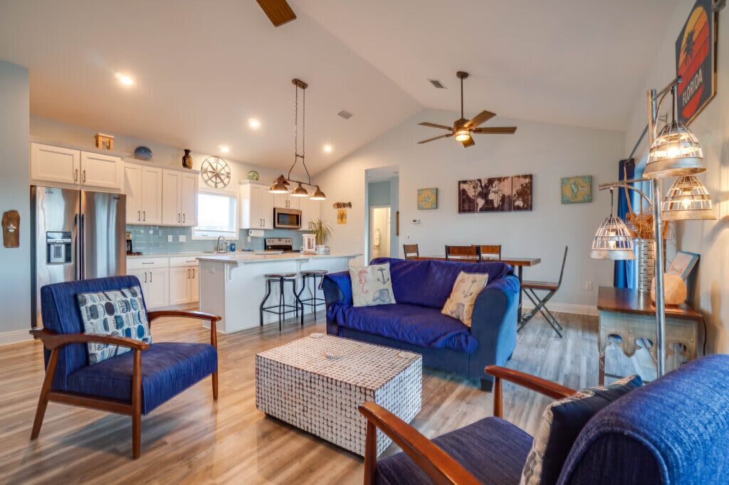 We had a wonderful time at this newly renovated home on the bay. The house is beautifully appointed, with all of the amenities desired. We loved the location- having a private dock on the bay and an easy bike ride or walk to the beach was perfect. We enjoyed watching the sunrise each morning from the porches. Even with the cooler weather, we were able to enjoy the pool one day and also used the firepit a couple of the evenings. Friendly neighbors and pleasant workmen were around at times but never a disturbance- nice and quiet. We would love to stay here again in the future!