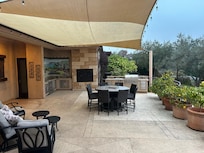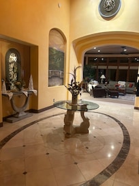 Inside, a dramatic entry, four bedrooms, four bathrooms, great room, formal dining, and an amazing view and outdoor area awaits you. Drive through the coded gate and garden adorned driveway, and park near or to the side of the front door area, where you will notice a large fountain area, yet another spot for some meditation or alone time, then enter the double doors through keyless entry and be amazed. A dramatic hallway with art from all over the world, leads to a living area that almost pulls you to the floor to ceiling windows and views beyond. To the right of the entry is a half bath and to the left area a formal dining room awaits 8 guests and perhaps a personal chef serving a meal to remember. Additionally the guest bedrooms and bathrooms are on this side of the home. Continuing ahead to the large open views area, a living room furnished with sofas, oversized chairs, large gas fireplace, and television invite conversation and gathering. Access to the pool and outdoor is available here, at the kitchen, and also the primary bedroom. To the left are a working area with desk and outlets for business or games, and a bar area supplied with a variety of glasses for beer, wine, and cocktails.