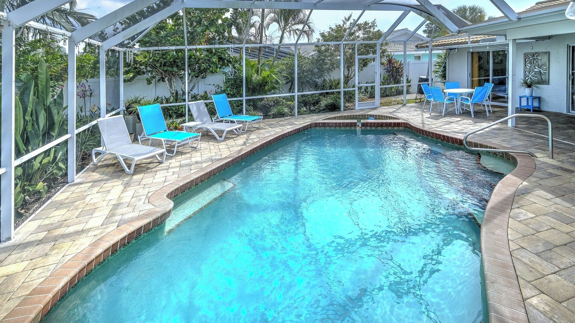 The home's main attraction is definitely its outdoor pool. The screened lanai boasts a sparkling pool where you can cool down and enjoy the Florida sunshine on the poolside loungers. The covered patio boasts a fire table and plenty of seats so you can lounge poolside while the group enjoys the refreshing waters. Host summertime cookouts thanks to the gas grill. This colorful abode also provides you with five beach chairs, one beach umbrella, and a washer/dryer.