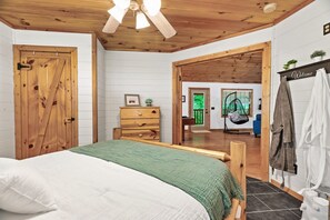 The Smoky Creek Hideaway is a uniquely designed farmhouse style cabin. Upon entering, you will notice the beautiful vaulted ceilings and open concept design. The kitchen leads into the living room where you will find a TV with Amazon streaming services and warm fireplace welcoming you to sit and relax. The cabin then continues into the Game Room, where you can let loose and have a little fun playing pool and sitting next to our repurposed whiskey barrel table. To the left of the game room through the double doors leads you into the Master Bedroom, where you will dream on a comfortable queen-sized mattress and soak in the Large Jacuzzi Tub.