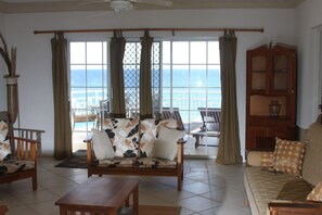 Amplio condominio frente al mar con la vida americana y comedor; cocina totalmente equipada con estufa y máquina de hielo nevera / congelador. Dormitorio principal con baño con cama king size, segundo dormitorio con dos camas individuales. Lavadora / secadora siempre. Televisión por cable con reproductor de DVD y servicio de internet wifi gratuito; llamada gratis para EE.UU. y Canadá. Impresora de inyección de tinta de color disponibles. Servicio de limpieza de cortesía Dos veces por semana. Lleve a su selección, relajarse en la playa aislada, tomar el sol en una silla de playa en el césped o simplemente tomar disfrutar de la piscina.