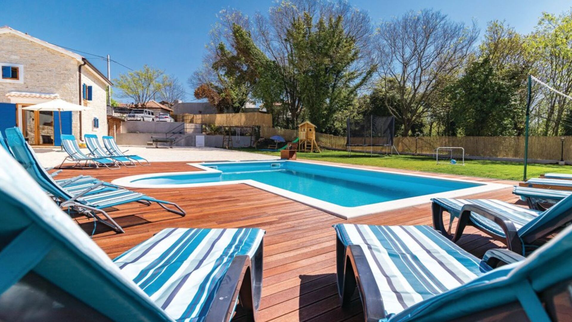 En el pueblo de Bibici, en el interior de Istria, se encuentra esta hermosa casa de vacaciones de planta baja. La propiedad ofrece varios juegos infantiles que sus hijos disfrutarán. El interior moderno y amueblado con buen gusto garantiza una sensación de bienestar durante su estancia. En los cálidos días de verano podrá refrescarse en la piscina y por la noche pasar momentos inolvidables con sus seres queridos en la barbacoa. Un camino de grava de unos 150 m conduce a la casa de vacaciones. Recomendamos una visita a las ciudades costeras de Porec, Rovinj y Pula, que ofrecen entretenimiento con diversos eventos durante los meses de verano.