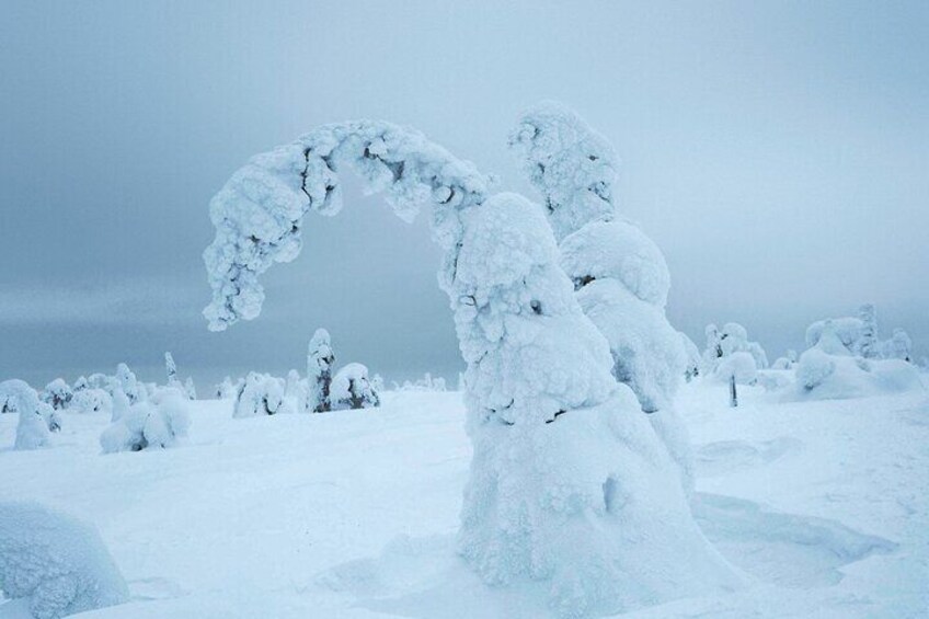 Experience the famous Riisitunturi National Park by night. Ski in silence between snow-covered trees and admire the phenomenas of the vast arctic night sky. The excursion culminates in a unique wild food dinner in the warmth of a fireplace. Skiing under the arctic night sky and wilderness dinner is an experience found nowhere else. Riisitunturi national park is famous around the world for it's beautiful landscapes, but not many have experienced it by night. Guided by a professional wilderness guide, we ski between the snow covered trees in the light of our head-lamps. The wintery forest of Riisitunturi comes to life in a magical way as light and shadow meet on our path. As we ascend higher, the arctic night sky opens up all around us. Depending on the weather, there are possibilities to see northern lights, a sky full of stars, a full moon or maybe a mystical foggy lanscape. The skiing ends with the renowned wilderness dinner in a traditional kota. Our private wilderness chef prepares a three course dinner on the fire from local wild food. Sit back and observe the culinary magic unfold and immerse in nature through the flavours of the forest.
