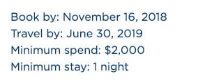 Minimum Spend: $2000 (minimum spend is the price of the travel reservation excluding any taxes, fees or additional costs). This spend must take place in one transaction.