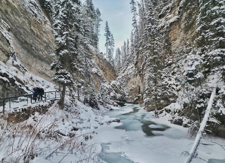 After your hike, enjoy warm drinks including hot chocolate, tea, or coffee on the journey to our next stop, Kootenay National Park, home to Marble Canyon, one of the region’s hidden winter gems. Traverse the canyon and take in the dramatic scenery before heading back to Banff, Canmore, and Harvie Heights. Don’t miss this breathtaking winter journey combining two of the Canadian Rockies’ most spectacular winter destinations.