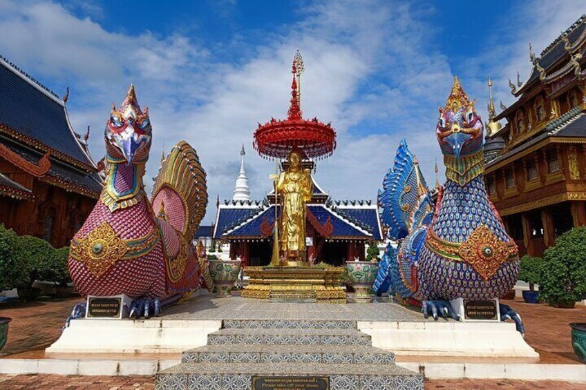 Our first destination is Wat Den Sali Si Mueang Kaen, more commonly known as Wat Ban Den. Considered one of the most striking temple complexes in Northern Thailand, it is beautifully set in the rolling green hills of Mae Taeng District, about an hour north of Chiang Mai. The temple, though traditional in style, is relatively modern. Much of the current complex was expanded under the guidance of a revered local abbot, Kruba Tua, who envisioned Wat Ban Den as both a sacred place of worship and a cultural landmark for the community. What makes the temple truly remarkable is its scale and artistic detail. Visitors will find a vast collection of ornate viharns (assembly halls), gilded pagodas, and meticulously crafted naga figures (mythical serpents believed to guard sacred spaces). Each building showcases a unique design and vibrant colors, blending classical Lanna architecture with elaborate modern craftsmanship.