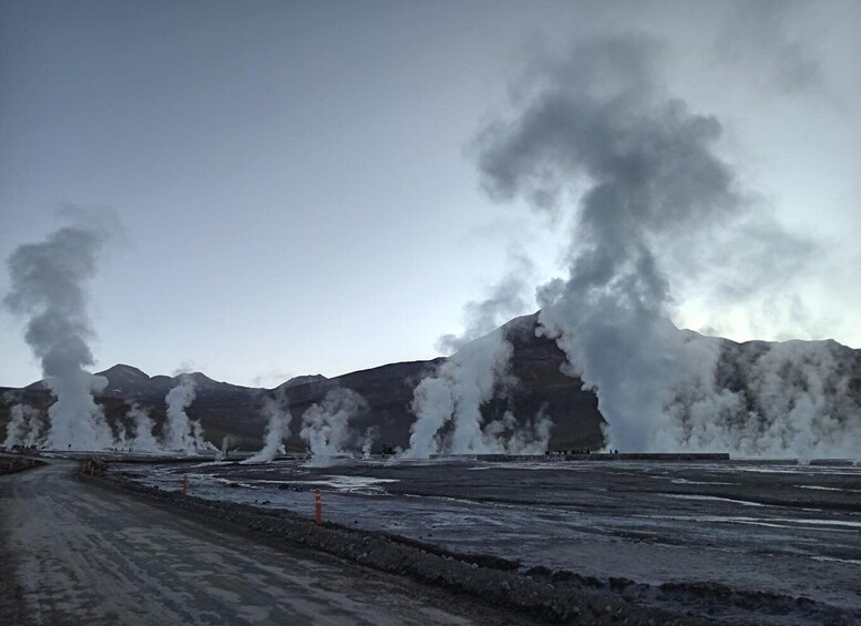 Depart from San Pedro de Atacama at 5 am, and travel until 6:45 to reach the geothermal fields, where the temperature is below zero. Hike around the geothermal fields, and observe the impressive columns of steam from the geysers.